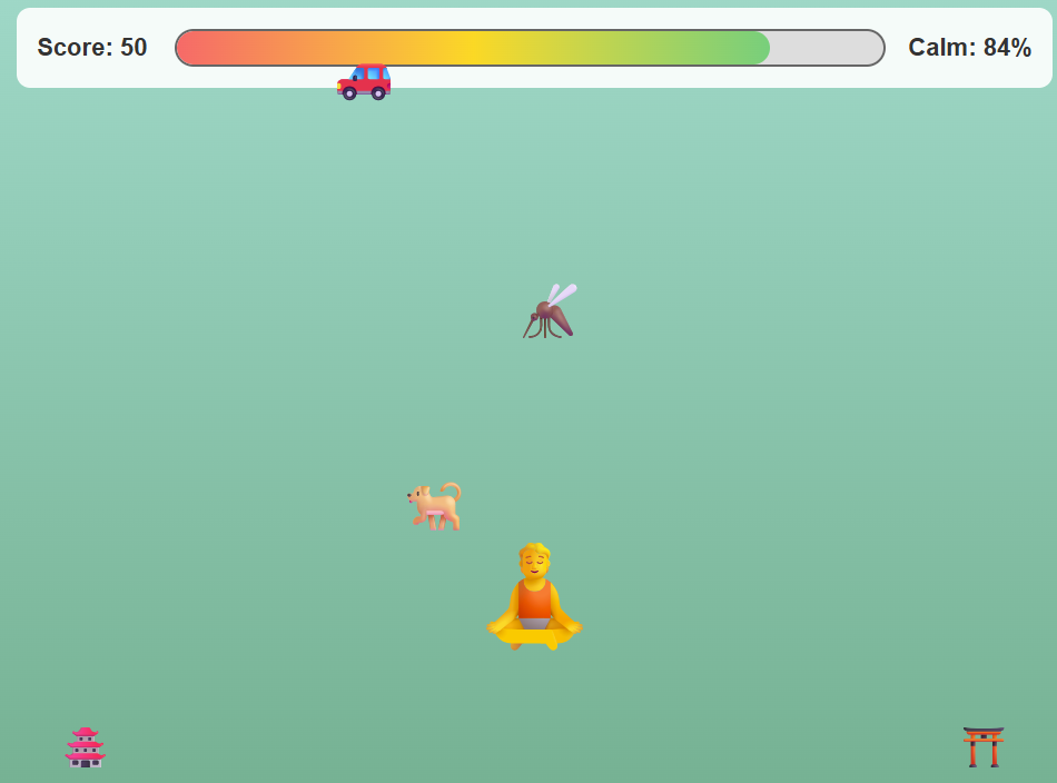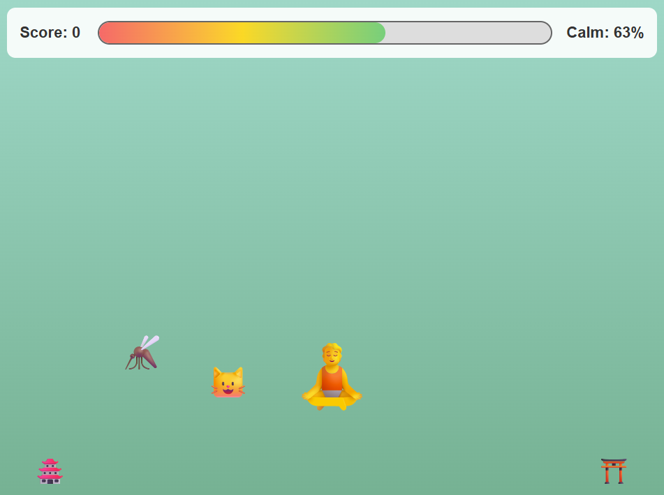 Click to shoo away distractions like mosquitos, cats, street noise, and more. Keep the calm meter high and see how long you can maintain meditation!